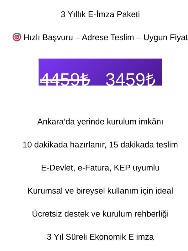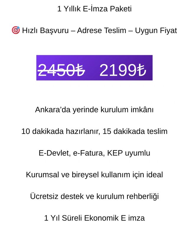 Firmamız, güvenli e imza çözümleri alanında hızlı ve güvenilir hizmet sunmak amacıyla kurulmuştur. Arkimza’nın bayisi olarak, yasal mevzuatlara uygun, kaliteli ve sürdürülebilir elektronik imza hizmetleri ile müşterilerimize en doğru şekilde ulaşmayı hedefliyoruz. Ankara genelinde hemen teslim, yerinde teslim ve mağaza teslim seçeneklerimizle, zaman kaybetmeden e-İmzanıza ulaşmanızı sağlıyoruz. İhtiyacınıza göre adresinize gelerek teslimat yapıyor veya mağazamızdan elden teslim imkânı sunuyoruz. Böylece hem bireysel hem de kurumsal müşteriler için hızlı, pratik ve güvenli bir süreç oluşturuyoruz. Müşteri memnuniyetini ön planda tutan yaklaşımımızla; satış öncesi bilgilendirme, kurulum desteği ve satış sonrası teknik destek hizmetlerini eksiksiz sunuyoruz. Amacımız, e-İmza süreçlerinizi sorunsuz ve en kısa sürede tamamlamanıza yardımcı olmaktır. Arkimza bayilik güvencesiyle, Ankara’da e-İmza denildiğinde akla gelen ilk adreslerden biri olmak için çalışmaya devam ediyoruz. Ayrıca, e imza fiyatları hakkında bilgi almak isteyen müşterilerimize de en güncel bilgileri sunarak, ihtiyaçlarına en uygun çözümleri sağlamayı amaçlıyoruz.